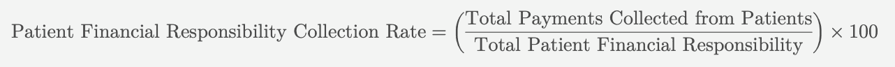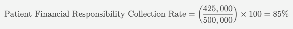 Suppose a healthcare provider’s patients are responsible for $500,000 after insurance adjustments, and the provider collects $425,000 from those patients. The patient financial responsibility collection rate would be calculated as: