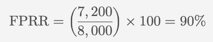 If a healthcare provider submits 8,000 claims in a month and 7,200 of those claims are paid on the first submission, the FPRR would be 90%, shown below: