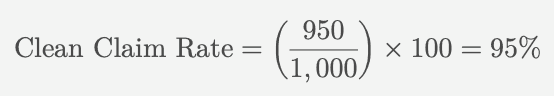 Suppose a healthcare provider submits 1,000 claims in a month, and 950 of those claims are submitted without errors (i.e. they are clean claims). The clean claim rate would be calculated as: