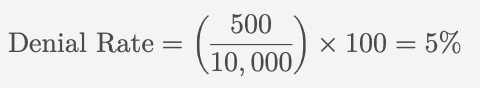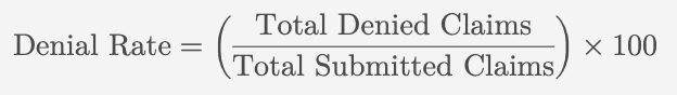 The denial rate represents the percentage of claims denied by payers. High denial rates can significantly impact cash flow and require additional resources to manage, and can be represented by the following formula: