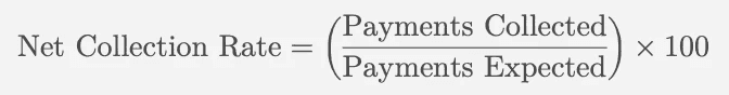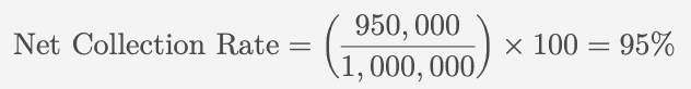 The net collection rate reflects the percentage of payments collected out of the total amount billed, after adjustments for contractual allowances and bad debt, and can be calculated using the following formula: