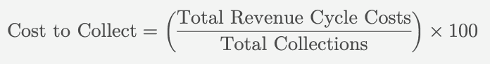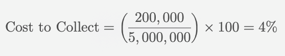 Suppose a healthcare provider incurs $200,000 in revenue cycle costs and collects $5,000,000 during a specific period. The cost to collect can be shown below: