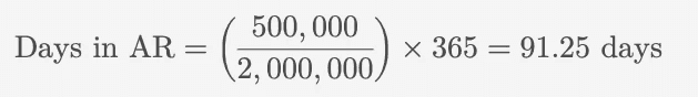 An example scenario would be a provider with $500,000 in total AR generating $2,000,000 in total credit sales for the past year. The days in AR for this provider would be calculated as: